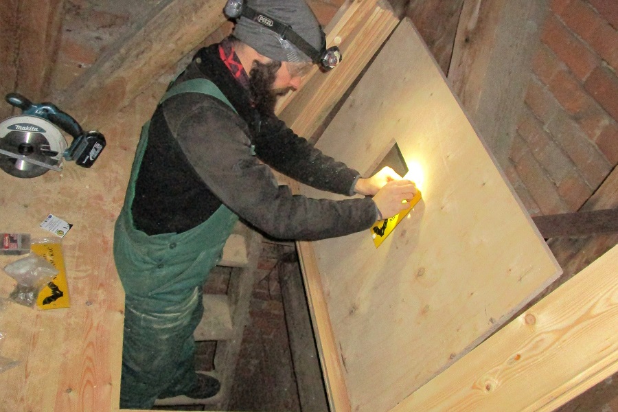 During the Winter season when bats are absent from their Summer colonies, the LIFE Podkowiec+ team works intensively in many roosts. One of the examples is the church in Bruśnik, where the project staff installs a platform collecting guano, thus easing up the cleaning actions, and additionally, separating the space in two rooms, making the lower part available as so called cool room, for the use during extreme heat periods.