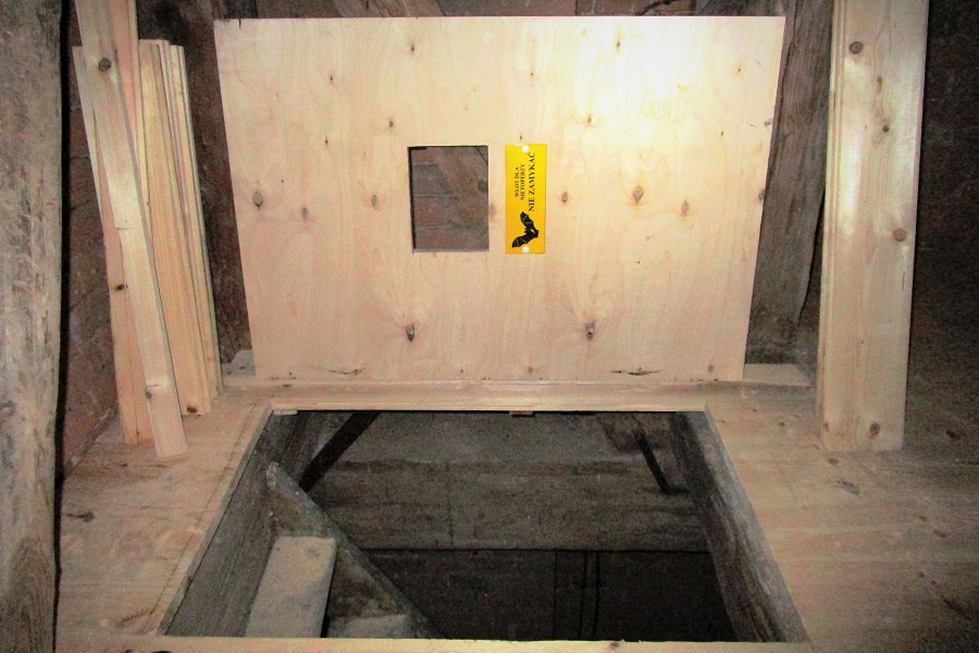 Some other improvements in Bruśnik are to make the space darker, and in consequence safer for the bats. Most of the raptors use sight when hunting. To prevent predation even more, special door were installed between two parts of the attic, and equipped in special anti-marten shelf. Whenever the raptor tries to jump onto the shelf, it swings, and the animals slips down back to the floor.