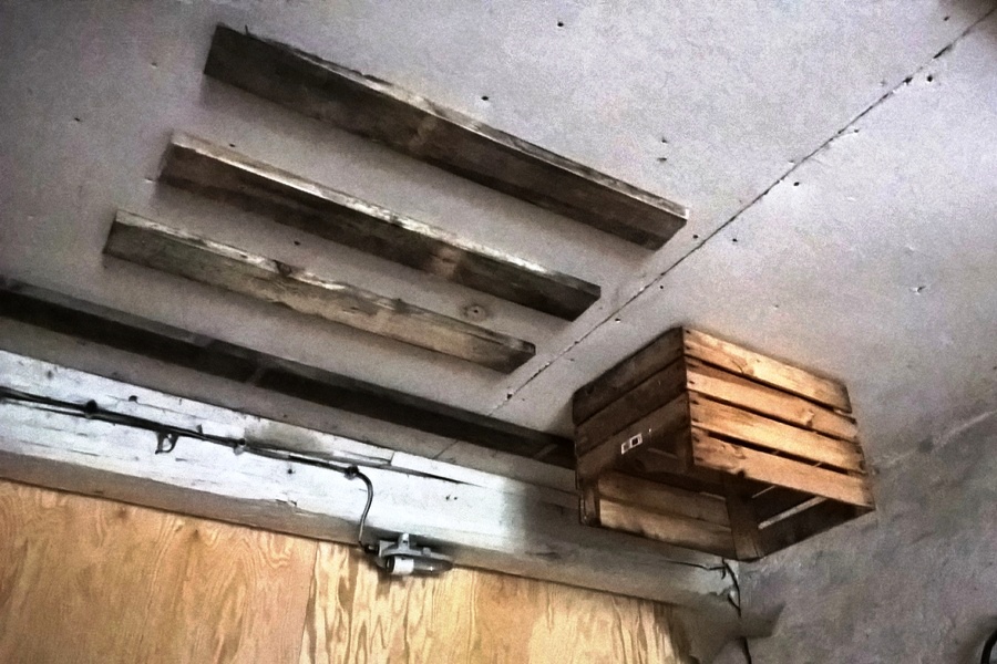 As some of the surfaces are very smooth, rough wood was used to ease up hanging of the bats on them. Fruit boxes and some battens have been fixed to the ceiling for this purpose.