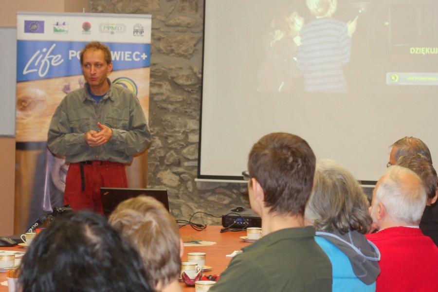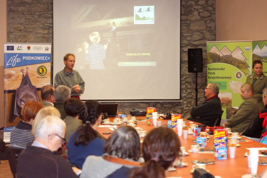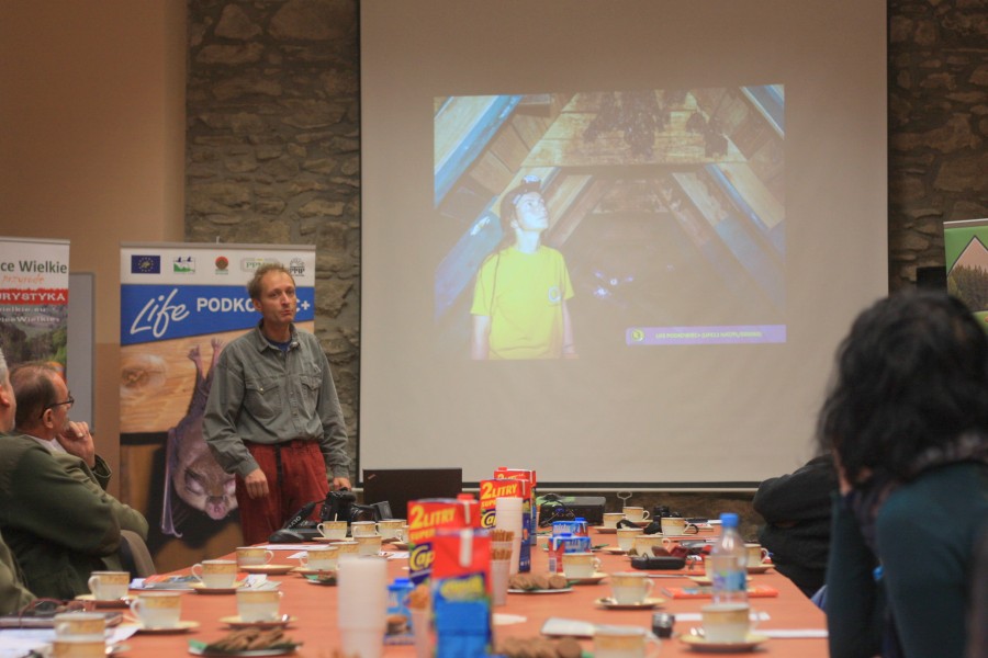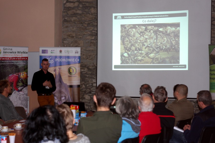 Koordynator projektu LIFE PODKOWIEC+, Rafał Szkudlarek wystąpił z prezentacją, dzięki której uczestnicy zapoznali się z zakresem działań ochronnych prowadzonych przez PTPP „pro Natura” na terenie Krainy Podkowca. Rafał Szkudlarek omówił sposoby korzystania przez nietoperze z budynków, a także metody wykrywania nietoperzy budynki zasiedlających. Nie zawsze można zobaczyć same zwierzęta, ale można wykryć ślady ich bytności, a niekiedy nawet je usłyszeć. Jednym ze śladów są odchody nietoperzy, zalegające na poddaszach guano może niekiedy stanowić problem, Rafał omówił sposób zaradzenia temu zjawisku, a przede wszystkim, na przykładach działań PTPP „pro Natura” zaprezentował sposoby poprawiania sytuacji nietoperzy – remontów zmierzających do utrzymania istnienia budynku z kolonią i adaptacji poprawiających warunki bytowania zwierząt zamieszkujących budynek, poprawy warunków termicznych, korekty oświetlenia czy likwidacji przeciągów.