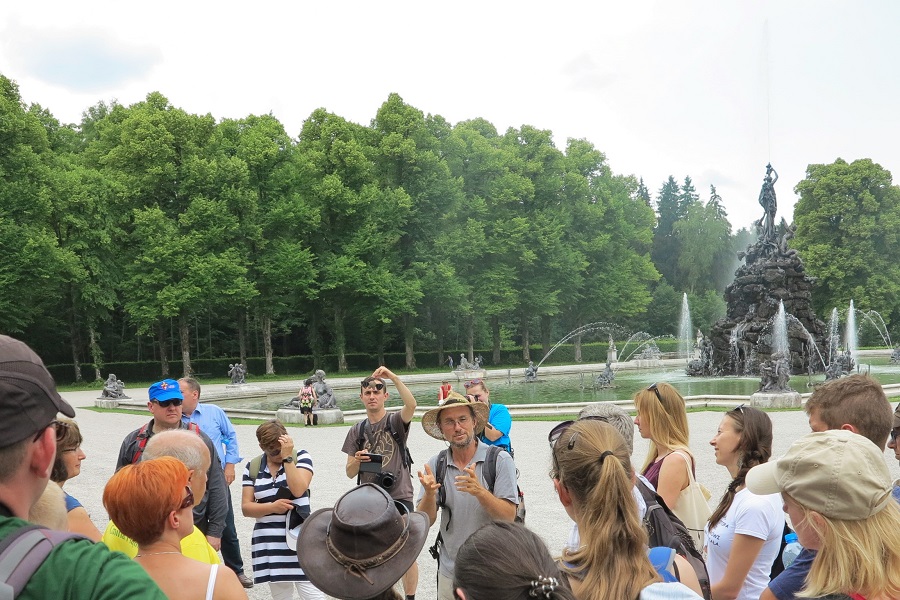 Warunki tu panujące są bardzo odmienne od spotkanych w Karyntii. Pod jednym dachem znalazły schronienie kolonie wszystkich trzech gatunków objętych projektem LIFE Podkowiec+. Jest tu 140 samic podkowca małego, 60 nocków dużych i 74 nocki orzęsione. A, że dach ten należy do zamku będącego kopią Wersalu, zbudowaną przez Ludwika Bawarskiego, nazywanego szalonym, dzienna liczba odwiedzających przekracza roczną liczbę gości w Feistritz. Dla nich właśnie przygotowana została wystawa o nietoperzach, której ważnym elementem są monitory, pokazujące na żywo sytuację w kolonii. O podkowcach i nockach opowiadał grupie Dr Andreas Zahn, przedstawiciel rządowego centrum Koordinationsstelle für den Fledermausschutz in Südbayern, zajmującego się badaniami i ochroną nietoperzy w południowej Bawarii.