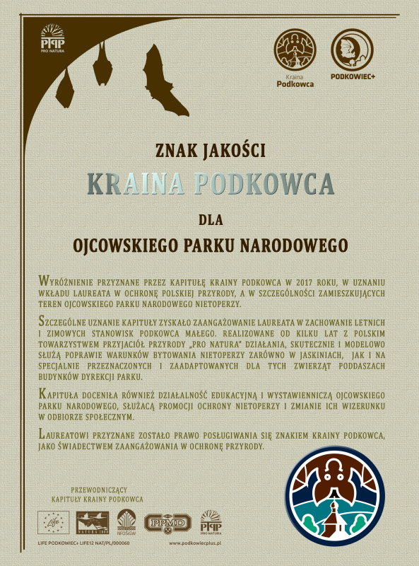 Ojcowski Park Narodowy jest szczególny wśród polskich parków narodowych. Nietoperze są na jego terenie jednym z najważniejszych elementów przyrody, co odzwierciedla między innymi logo Parku. Działalnośc Parku przyczynia się do ochrony stanowisk zimowych i letnich, w tym kolonii podkowca małego w seidzibie Dyrekcji Parku.